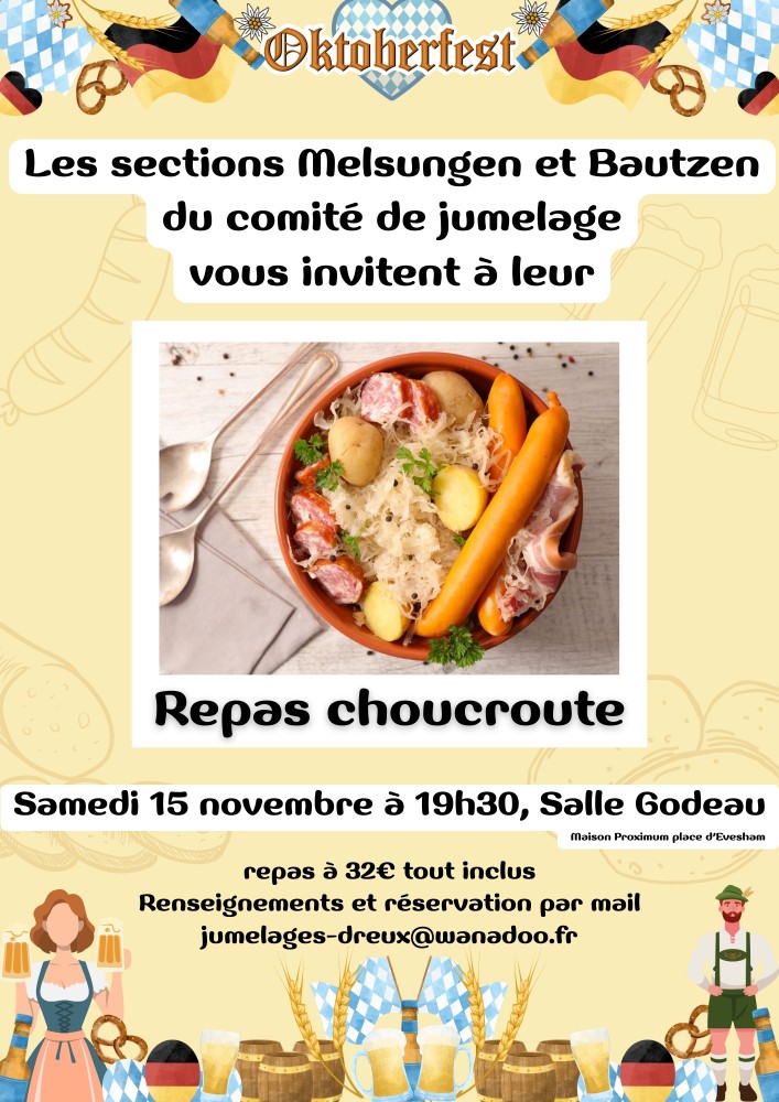Le comité de jumelage a le grand plaisir de vous inviter à sa soirée « Oktoberfest », où nous pourrons déguster une fabuleuse choucroute accompagnée de sa bière bien fraîche. Des animations ludiques mais aussi traditionnelles vous seront proposées - attention, ça va danser !