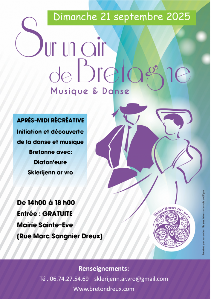 Après-midi musique et danses pour partager la culture bretonne ,animée par les musiciens et chanteurs de Sklerijenn ar vro et nos amis du groupe Diaton'Eure . Initiation aux danses, partage de nos activité et rencontre avec les adhérents, buvette et vente de crêpes. Entrée libre et gratuite.