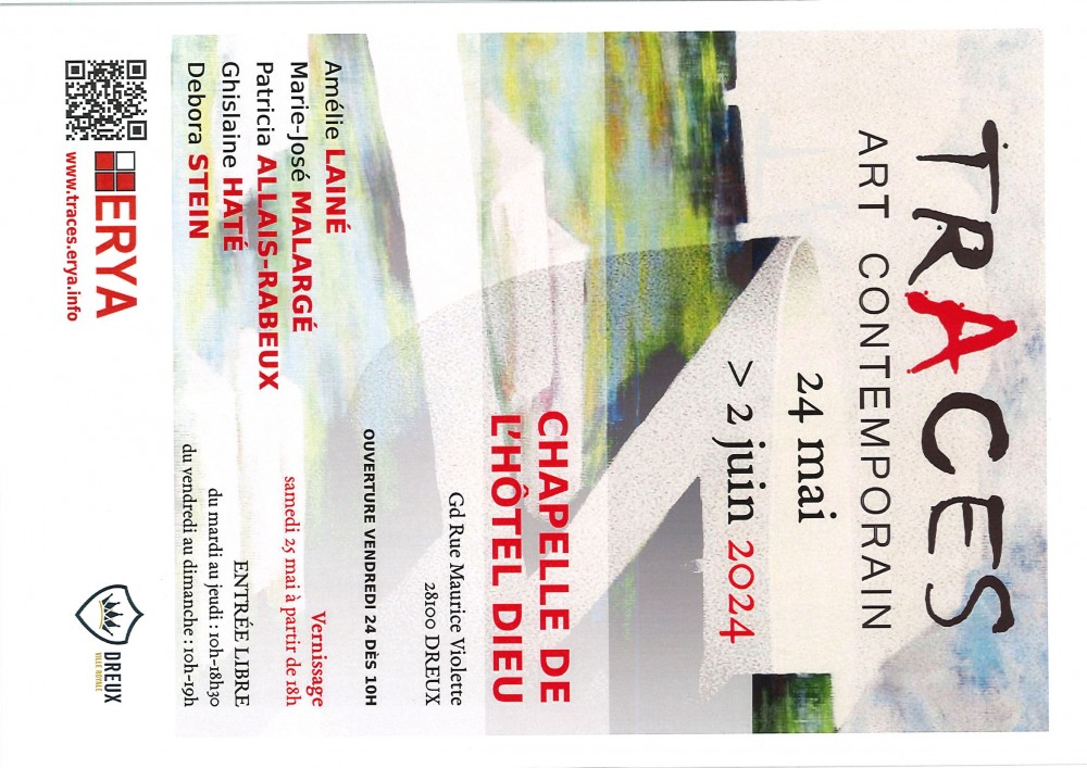 L'association ERYA présente l'exposition TRACES, pour sa quatrième édition, les artistes Amélie Lainé, Marie-José Malargé, Patricia Allais-Rabeux, Ghislaine Haté et Debora Stein vous présenteront leurs œuvres. Ouverture le 24 mai à 10h jusqu'au 2 juin, le vernissage a lieu le samedi 25 mai à partir de 18h.