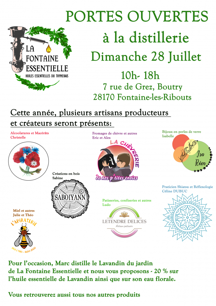 La distillerie de Thymerais « La Fontaine Essentielle » vous ouvre ses portes. Pour l'occasion, Marc distille le Lavandin de son jardin et vous propose - 20 % sur l'huile essentielle de Lavandin ainsi que sur son eau florale.