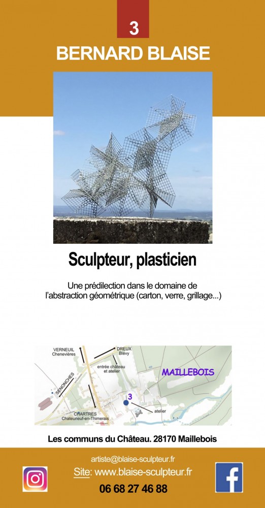 Bernard Blaise, plasticien professionnel, travaille le fer, le verre, le carton et crée des structures géométriques abstraites.