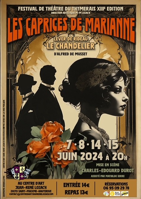 Pour ce Festival : un Lever de rideau de 50’ avec LE CHANDELIER d’Alfred de Musset… Ripailles dans la Grange, puis LES CAPRICES de MARIANNE ( 1.h10) dans Le Théâtre.