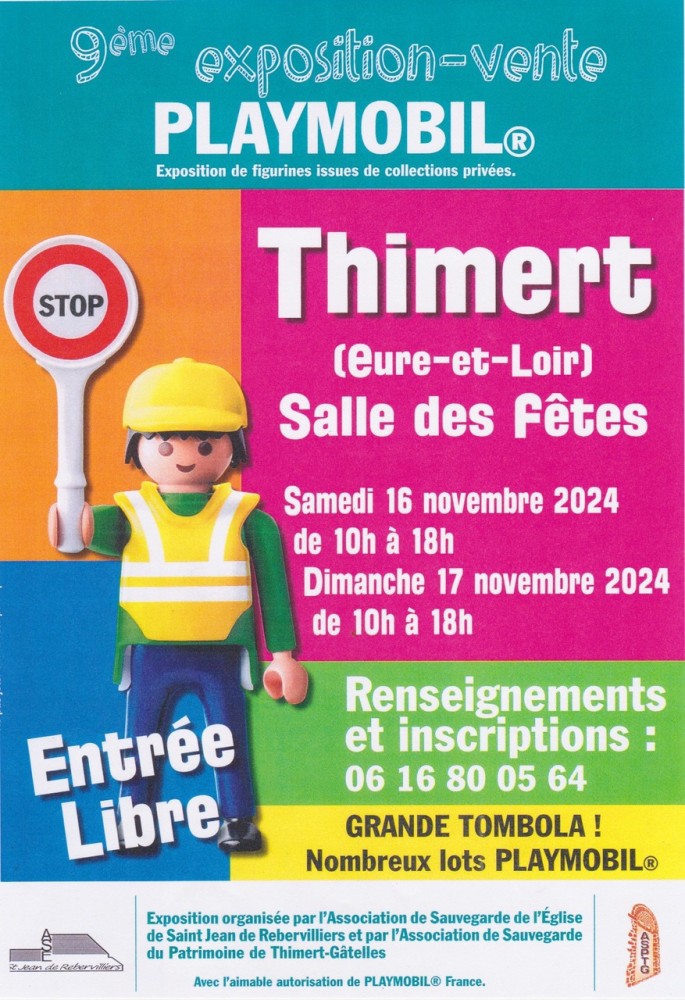 L’Association de Sauvegarde de l’Eglise de St Jean de Rebervilliers et l’Association de Sauvegarde du Patrimoine de Thimert-Gâtelles organisent leur exposition-vente annuelle PLAYMOBIL au profit de la restauration du patrimoine de chaque commune. Une tombola dotée de lots PLAYMOBIL est proposée les samedi 16 et dimanche 17 novembre à 18h00. L'exposition a lieu de 10h00 à 18h00 dans la Salle des Fêtes de Thimert.