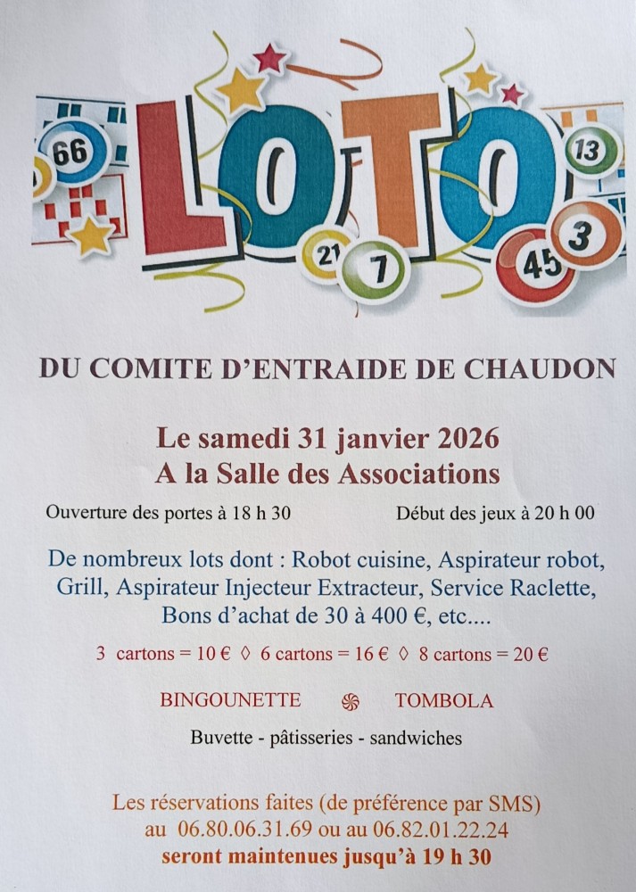 LOTO DU COMITE D'ENTRAIDE DE CHAUDON LE SAMEDI 31 JANVIER 2026 SALLE DES ASSOCIATIONS A 20H00. OUVERTURE DES PORTES A 18H30.