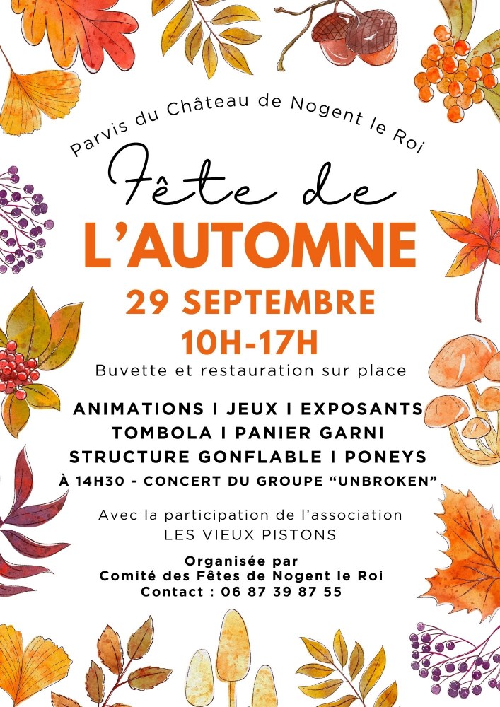 Après deux premières éditions réussies, le Comité des Fêtes de Nogent-Le-Roi vous propose la 3ème Fête de l'Automne, le dimanche 29 septembre 2024 de 10h à 17h sur le parvis du Château de Nogent le Roi (28210).