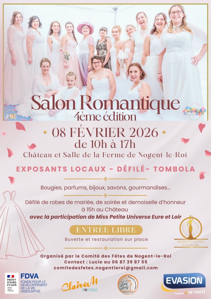 - Défilé au château à 15h : robes de mariée, de soirée et demoiselles d’honneur avec la participation de Miss Petite Universe Eure-et-Loir