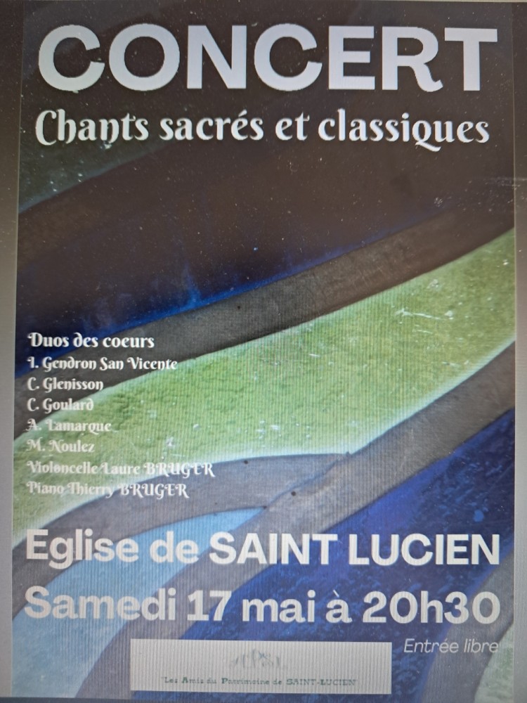 Vous trouverez ci-joint l’affiche et le programme du concert organisé par les Amis du Patrimoine de Saint Lucien le 17 mai à 20H30 à l’église de Saint Lucien.