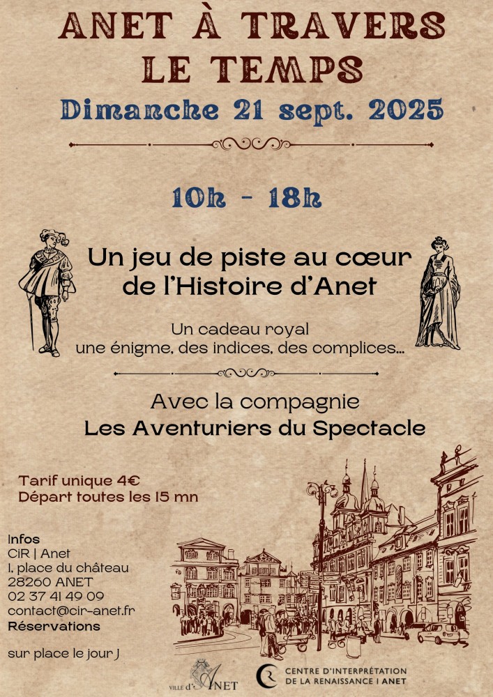 Voyageur du temps ! Plongez dans l'Histoire d'Anet, parcourez ses rues, trouvez les indices, résolvez les énigmes et rencontrez les complices qui vont vous aider à déjouer les obstacles et remplir votre mission.