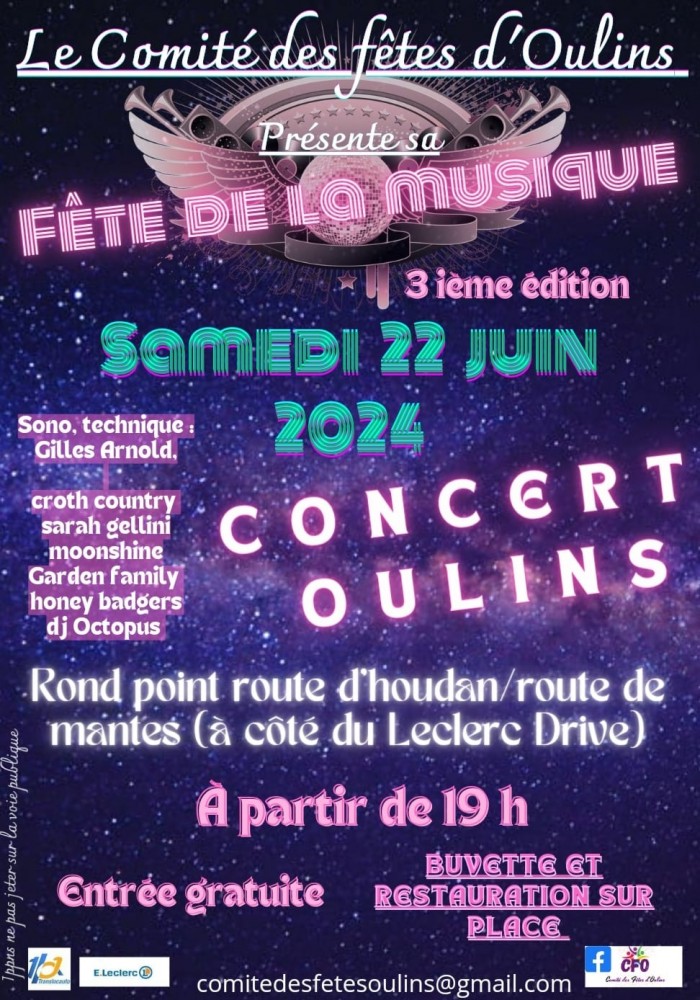 Nous organisons notre 3ème édition de la fête de la musique sur la commune d' Oulins, de nombreux artistes et groupes vont se succéder sur scène plus talentueux les uns que les autres pour nous promettre une très bonne soirée. Nous accueillons cette année les danseurs de country pour une démonstration entre chaque artiste.