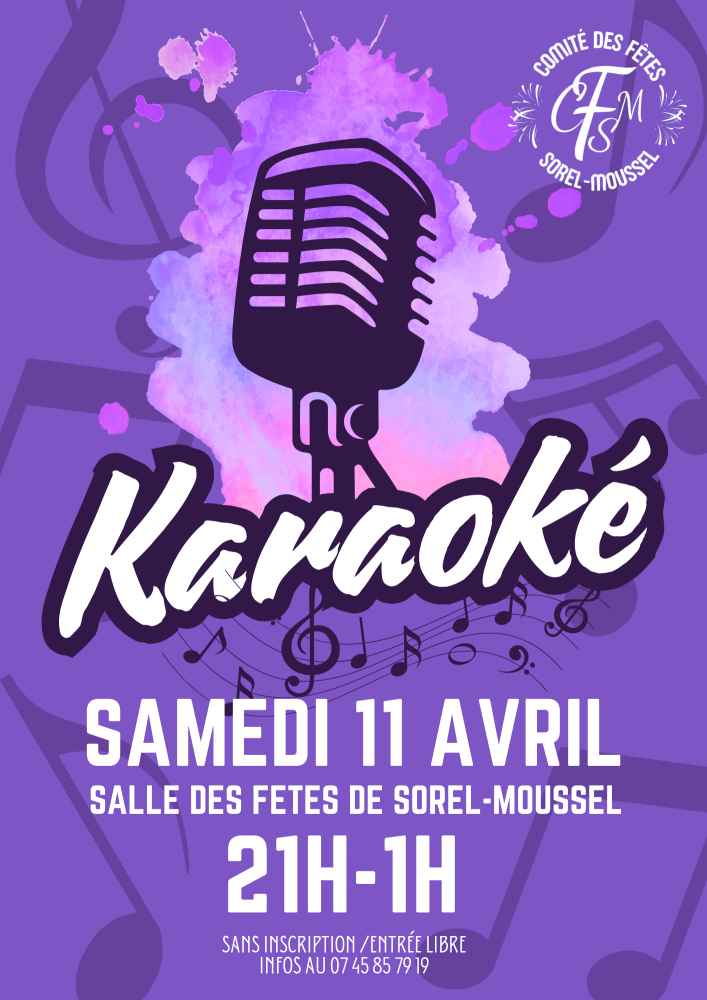 Le Comité des fêtes de Sorel-Moussel vous propose une nouvelle soirée Karaoké le samedi 11 avril à partir de 21h à la salle des fêtes, 13 place de la mairie. Ambiance garantie !