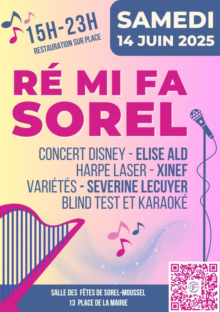 RE MI FA SOREL : NOUVEL ÉVÉNEMENT À SOREL-MOUSSEL ! Concert Disney par Élise Ald à partir de 15h, Harpe Laser par Xinef, Variétés par Séverine Lecuyer, Blind test et Karaoké par le CFSM. Nous vous attendons nombreux pour fêter ensemble la musique dans sa diversité !