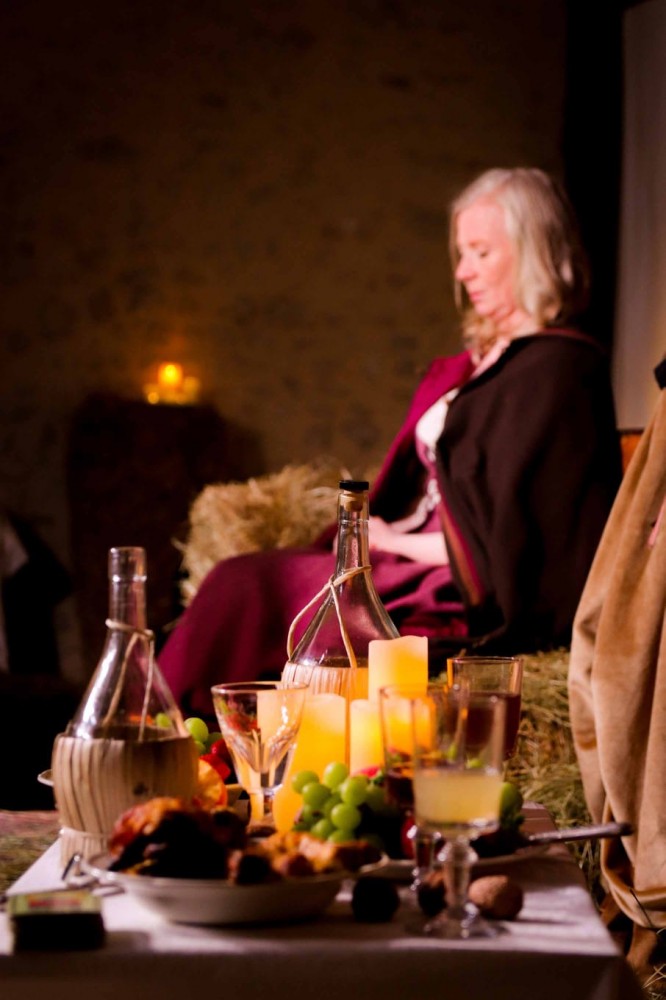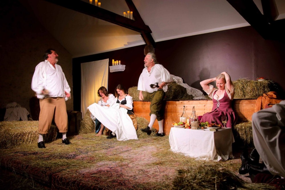 Sur scène, Molière et quelques-uns de ses compagnons de troupe, habillés en costumes de ville d'époque, se retrouvent pour un simple repas, dans la fraîcheur d'une grange, au milieu des bottes de paille. Entre éclats de rire et moments de complicité, ils s'amusent à rejouer leurs scènes préférées, notamment celles autour de l'amour, tirées des œuvres majeures de Molière.