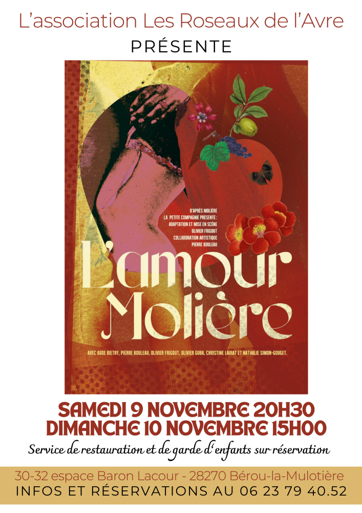L’association Les Roseaux de l’Avre a le plaisir de vous annoncer la tenue de la pièce de théâtre « L’Amour Molière », qui se jouera les samedi 9 novembre à 20h30 et dimanche 10 novembre à 15h à l’adresse suivante :