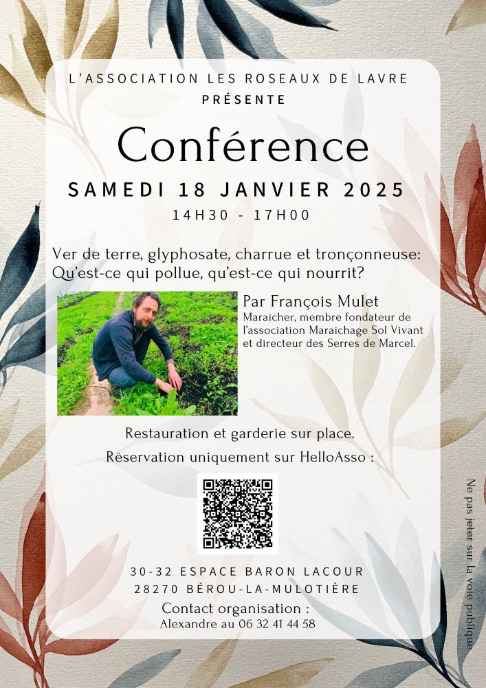 Une conférence débat animé par François Mulet président de la société Ver de Terre Production autour du thème de la « pollution ». Une conférence avec des cataclysmes planétaires, de la physique quantique, des nanotechnologies, des chats qui passent dans des broyeurs et les gentils qui gagnent à la fin.François Mulet, avec sa société Ver de Terre Production, a développé la chaîne youtube qui est aujourd'hui un des principaux media professionnels français abordant la thématique de l'agroécologie, des sols vivants et du développement agricole.Ver de terre production c'est aussi un organisme de formation et de développement agricole travaillant avec des centaines d'experts et de formateurs français pour mettre en œuvre la transition agroécologique.François Mulet est au quotidien agriculteur, formateur et expert en développement agricole. Il viendra pour une après-midi nous partager son expérience professionnelle, et celle de son réseau, afin de nous aider à comprendre, ce qu'est une pollution, une nourriture, le vivant, l'inerte et nous aider à faire le tri dans toutes les idées reçus dans le bruit médiatique de« l'écologie ».