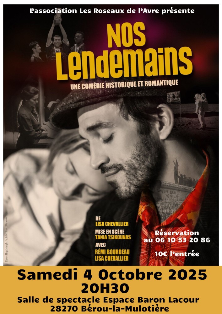 L'association Les Roseaux de l'Avre vous convie à la représentation de « Nos lendemains », une pièce écrite par Lisa Chevallier, interprétée par Rémi Bourdeau et Lisa Chevallier et mise en scène parTania Tsikounas.