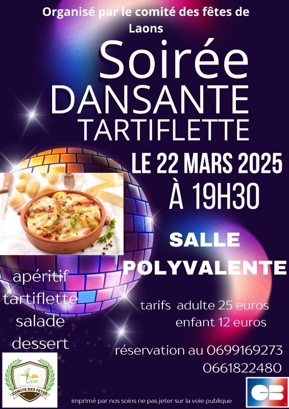 Soirée dansante TARTIFLETTE du 22 Mars 2025, organisée par le comité des Fêtes de LAONS, à la Salle Polyvalente de LAONS.
