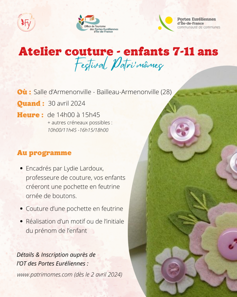 Dans le cadre du Festival Patri'mômes en Eure et Loir, j'ai le plaisir de proposer pour la 2e année, des ateliers de couture pour les enfants de 7 à 11 ans.