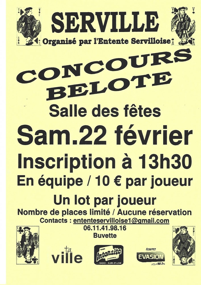 L’Entente Servilloise organise un concours de belote à la salle des fêtes de Serville (N12 entre Dreux et Houdan) le samedi 22 février 2025.