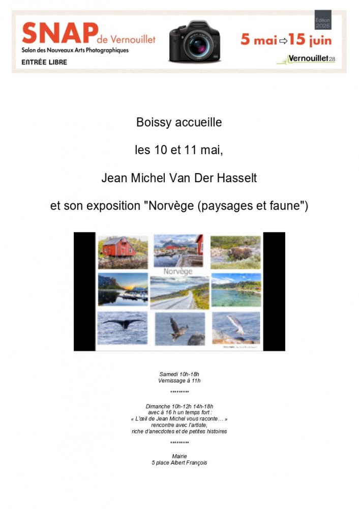 Dans le cadre du SNAP 2025, Boissy accueille, les 10 et 11 mai, Jean Michel Van Der Hasselt et son exposition « Norvège (paysages et faune) ». Vous pouvez venir découvrir ses photos, le samedi de 10h à 18h (Vernissage 11h) ou le dimanche de 10h à 12h ou de 14h-18h. A noter, temps fort le dimanche à 16h : « L'oeil de Jean Michel vous raconte... » Ce sera l'occasion de rencontrer l'artiste qui vous racontera anecdotes et petites histoires de son périple norvégien. Nous vous attendons nombreux !