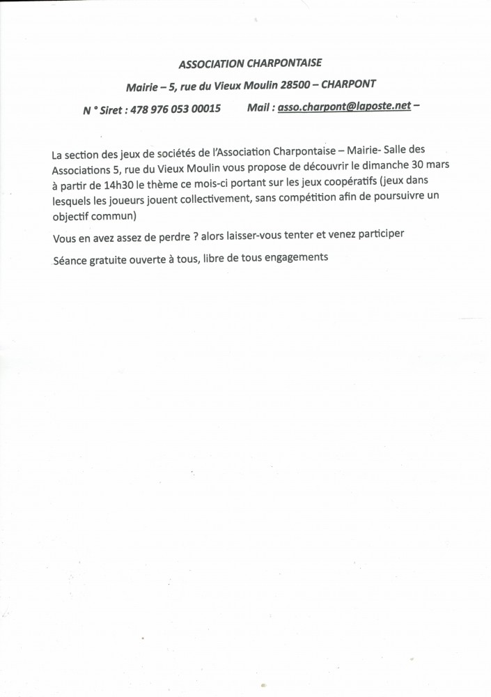 La section jeux de l'Association Charpontaise vous propose de découvrir ce mois-ci l'univers des jeux coopératifs.