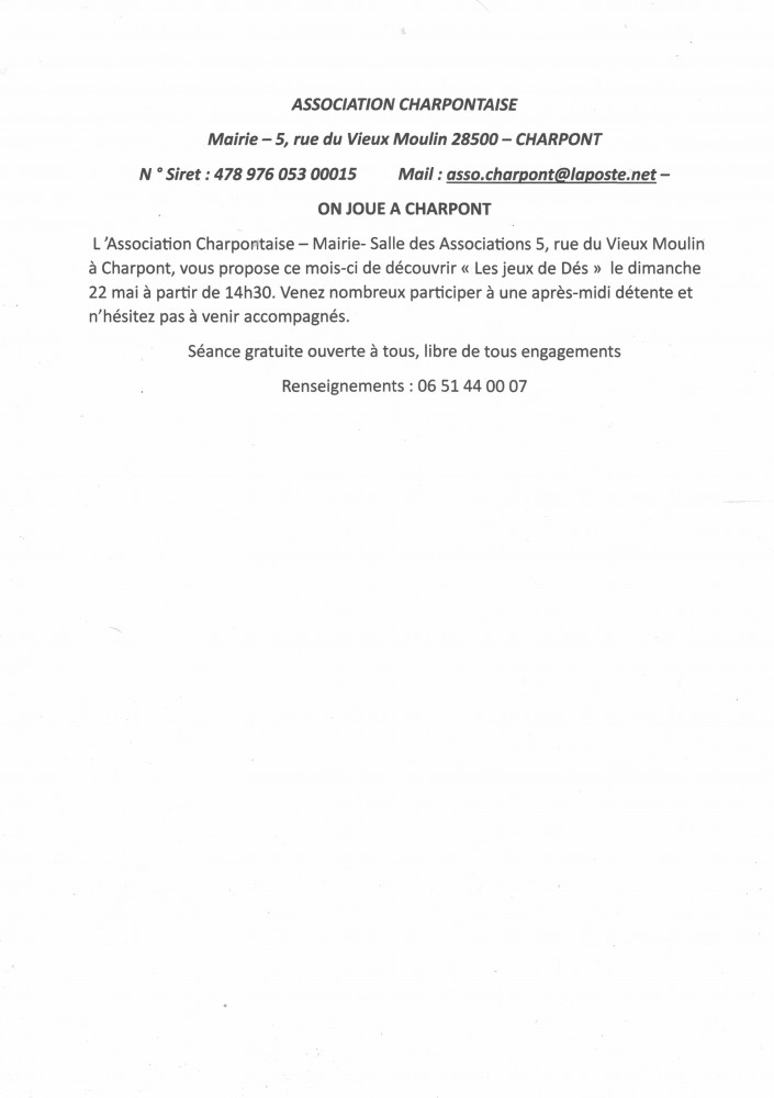 L'Association Charpontaise vous propose ce mois-ci de découvrir « Les jeux de dès » au cours d'une après midi de détente.