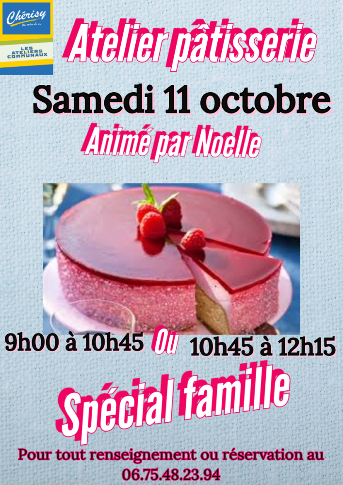 Rejoignez Noelle, notre experte en pâtisserie, pour une matinée créative et gourmande le samedi 11 Octobre, à la salle communale. Deux créneaux sont proposés : de 9h00 à 10h30 ou de 10h45 à 12h00 environ.