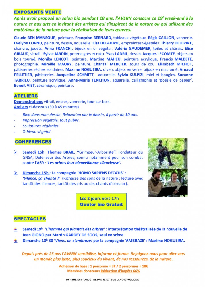 Après avoir proposé un salon bio pendant 18 ans, l'AVERN consacre ce 19e week-end à la nature et aux arts en invitant des artistes qui s'inspirent de la nature ou qui utilisent des matériaux de la nature pour la réalisation de leurs œuvres.