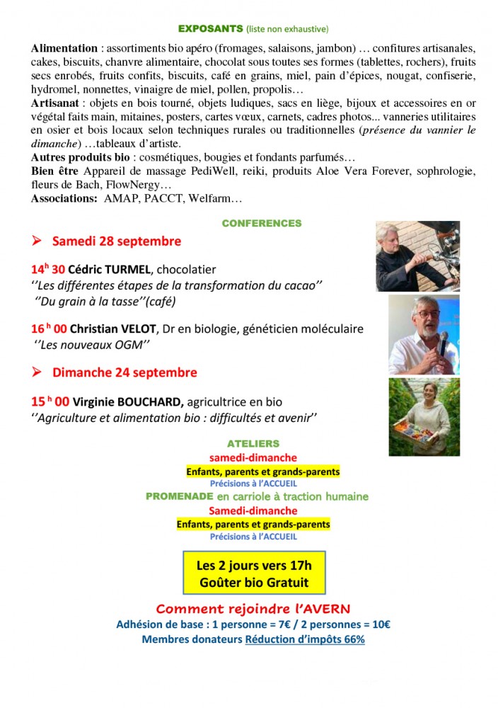 Vous y trouverez des exposants, assisterez à des conférences, participerez à des ateliers et profiterez d'un goûter bio gratuit les 2 jours