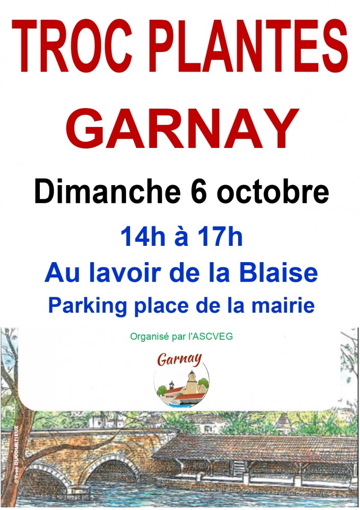 Je vous informe que le TROC PLANTES d’automne du printemps de Garnay, organisé par l'ASCVEG aura lieu le dimanche 6 Octobre 2024 de 14 à 17 heures.