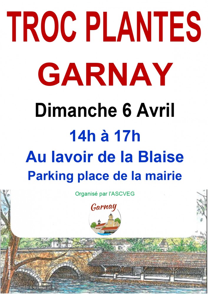Je vous informe que le TROC PLANTES du printemps de Garnay aura lieu dimanche 6 Avril 2025 de 14h à 17H au lavoir du village.