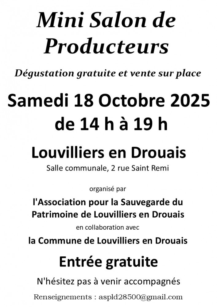 Dégustation gratuite (et vente sur place) de Vin de Saumur et de produits locaux (confitures, huiles alimentaires, farines, légumes frais, miel) ainsi que des gâteaux maisons organisée par l'Association pour la Sauvegarde du Patrimoine de Louvilliers en Drouais en collaboration avec la Commune de Louvilliers en Drouais.