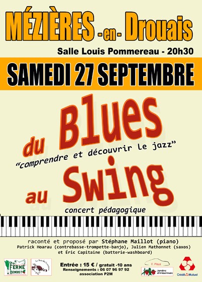 Samedi 27 septembre 2025 à 20h30, soirée/conférence jazz, « du Blues au Swing, comprendre et découvrir le jazz » à la salle Louis Pommereau de Mézières-en-Drouais.