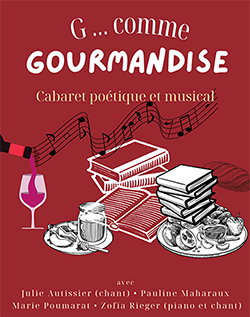 Le spectacle, intitulé « G… comme Gourmandise », interprété par quatre artistes, deux musiciens-chanteurs et deux comédiennes se joue sous la forme d’un Cabaret gourmand qui allie les mots et les mets. Les délices de la table et les plaisirs gustatifs se mêlent aux notes des chanteurs et aux mots des poètes avec Baudelaire, Hugo, Cendrars, Queneau, Apollinaire, Roubaud, Obaldia, Norge, François Morel, Henri Duvernois et « la dame chez le pâtissier », l’oulipien Paul Fournel et son « Bel appétit », Prévert, Desnos, « Les confitures » d’Andrée Chedid et celles des Frères Jacques, un texte surprenant de Jean-Pierre Coffe et des chansons de Boris Vian, Brel, Jehan Jonas, Pascal Parisot, Serge Gainsbourg et Juliette …