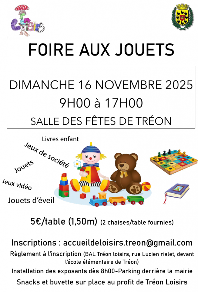 Tréon Loisirs organise une foire aux jouets (vente de jeux de société, jeux vidéo, jouets enfants, jouets d’imitation, jouets d’éveils, livres enfants, déguisements enfant, puzzles, articles de sport, jouets d’extérieurs, figurines, cartes de collection. Pas de vêtements ou d’articles de puériculture) le dimanche 16 novembre 2025 de 9h à 17h à la salle des fêtes de Tréon.