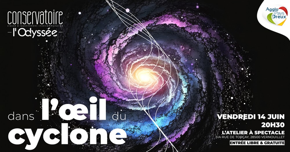 Danse, musique, théâtre... Découvrez le spectacle de fin d'année du Conservatoire de l'Odyssée. Voyagez entre mélodies pluvieuses et ensoleillées, explorez les années folles de l'entre-deux guerres, laissez-vous emporter par un tourbillon de jazz, de rock ou de symphonie. Une soirée à travers les âges et les arts, réunis dans l'œil du cyclone, vous attend !