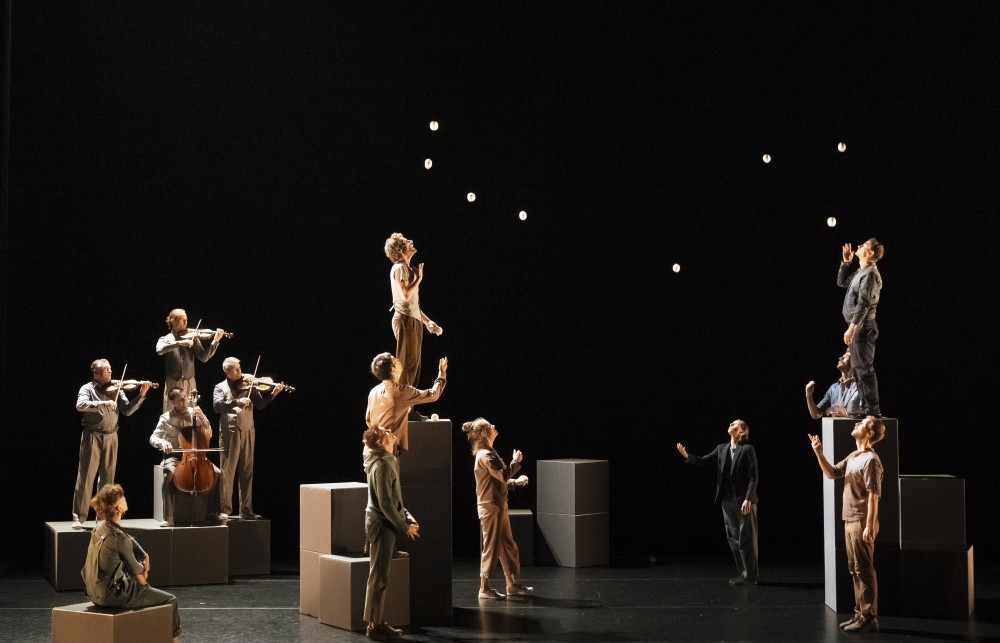 L’espace scénique modulaire évoque toutes sortes d’espaces et structure la relation des personnages entre eux permettant ainsi de se dévoiler, de se fondre dans le mouvement commun pour proposer un monde de jeux, de relations, d’espièglerie, de lyrisme, de musique et de danse.