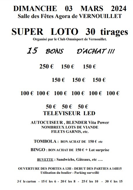 SUPER LOTO 30 tirages Organisé par le Club Omnisport de Vernouillet