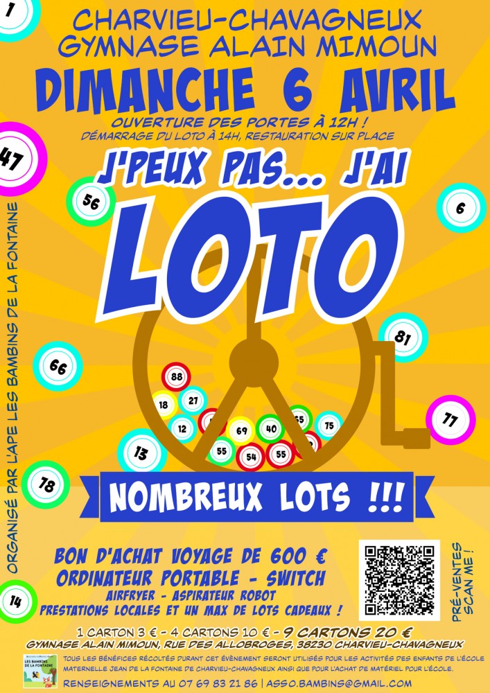 Ne manquez pas le Grand Loto organisé par l'APE Les Bambins de la Fontaine le dimanche 6 avril 2025 au Gymnase Alain Mimoun à Charvieu-Chavagneux ! Venez tenter votre chance et repartez avec des lots exceptionnels :
