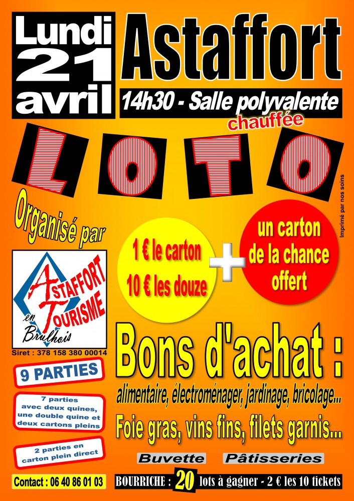 Neuf parties : deux en carton plein direct et sept avec deux quines, une double quine et deux cartons pleins. Tirage d'une bourriche à l'entracte.
