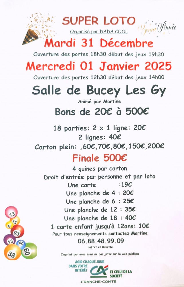 Loto du Mardi 31 décembre 2024 : ouverture des portes à 18h30 début des jeux à 19h30