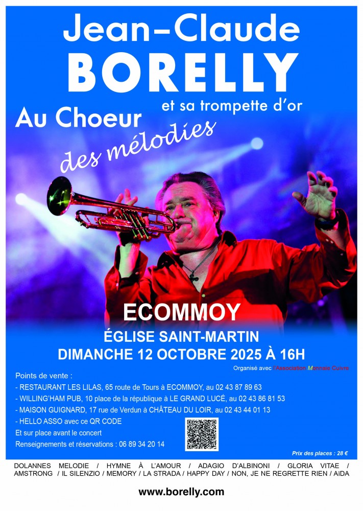 Le célèbre trompettiste Jean-Claude BORELLY, qui fête cette année ses 50 ans de carrière est en tournée en différentes régions de France où il rencontre un énorme succès. Il vous présentera son nouveau concert en l'Eglise Saint-Martin à Ecommoy (72220). Le Dimanche 12 Octobre 2025 à 16H00. Concert organisé avec l'Association Monnaie Cuivre. Ce programme intitulé « Au Choeur des Mélodies », est un véritable spectacle où la mise en lumière, sobre et artistique, accompagne à la perfection le jeu instrumental de l'Artiste au gré de ses mouvement et de ses déplacements qui n'ont de cesse de faire vibrer la sensibilité de l'assistance, grâce aux sonorités inégalées de sa trompette et au rayonnement spirituel des lieux où il se produit. Concernant le concert, il durera environ 2H00 avec entracte. Jean-Claude BORELLY, vous interprètera des airs classiques, du gospel, du jazz, des airs de l'Adagio d'Albinoni, l'incontournable II Silenzio, des musiques de films, des compositions de: Barbra Streisand, Pierre Bachelet, Edith Piaf, etc. Sans oublier le célèbre Dolannes Mélodie. « Concert inoubliable, à ne pas manquer ». Jean-Claude BORELLY, c'est aussi 20 albums enregistrés ! 22 disques d'or ! plus de 15 millions de disques vendus dans 23 pays. Et des milliers de concerts à travers le monde entier.