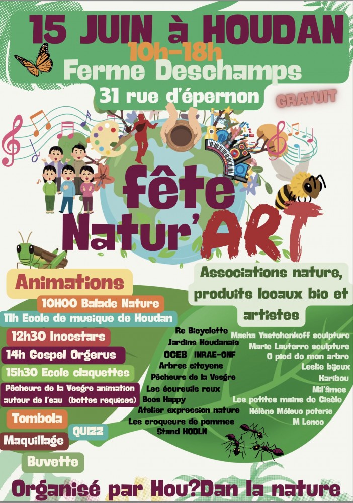 L'art et la nature font bon ménage, et nous proposons de le démontrer avec cette journée où on pourra rencontrer des acteurs de la protection de la faune et de la flore : savoir réparer et entretenir son vélo, greffer ses arbres, produire ses fruits et légumes, participer à des ateliers d'expressions nature, comprendre les enjeux de la biodiversité, connaitre les arbres et la forêt, aider à sauvegarder les écureuils roux, et aussi des artistes et artisans qui vont présenter des bijoux, tableaux, poteries, macramé, sculptures, créations en papier ou en ciment et béton, macramé et tricot... On pourra aussi aller observer, avec des bottes, les petits habitants (poissons, écrevisses...) de la Vesgre, acheter des plantes, du miel, des savons maison, fabriquer son sachet de lavande, se restaurer et s'hydrater au bar, en écoutant l'école de musique, un groupe gospel, le groupe Inocstar, regarder un spectacle de claquettes, participer à la tombola et à la chasse aux tampons pour gagner des lots, partir en balade à la découverte de notre flore, se faire maquiller…. Et d'autres surprises. Un beau programme pour une belle journée pour tous les âges.