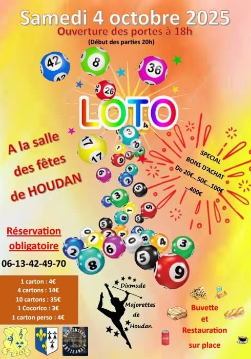 Les Majorettes de Houdan organisent leur loto le samedi 4 octobre à la salle des fêtes de Houdan. Ouverture des portes à 18h, début des jeux à 20h.