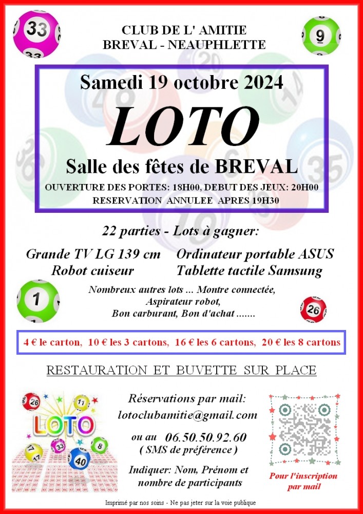 Réservation conseillé au 06.50.50.92.60 ou par mail : lotoclubamitié@gmail.com