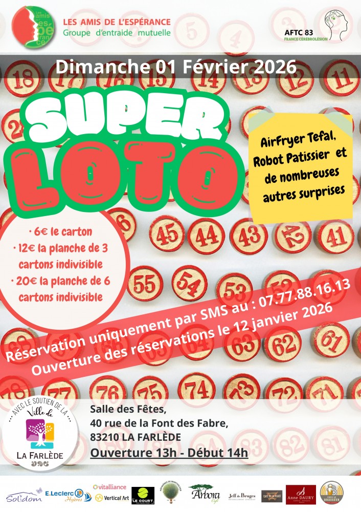 Le GEM Les Amis de l'Espérance organise son loto annuel le dimanche 1er février 2026 à La salle des fêtes de La Farlède.