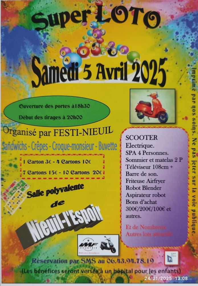Festi'Nieuil organise le 5 avril 2025 son loto annuel dont les bénéfices seront donnés à l’association « un hopital pour les enfants ». Les portes de la salle polyvalente de Nieuil l'Espoir ouvriront à 18h30, début des parties à 20h. Parmi les lots, 1scooter électrique,1 SPA 4 personnes ,1 téléviseur 108 cm, 1 friteuse airfryer, 1 aspirateur robot, 1 robot blender, 1 sommier+ matelas 140, plusieurs bons d’achats de 300 euros, 200 et 100 euros, 1 barre de son, et de nombreux autres lots attractifs.Seront jouées 10 parties de 3 lots. La restauration sera possible sur place avec sandwichs, crêpes, croque-monsieur, buvette. Réservation par sms au 06.43.94.78.19